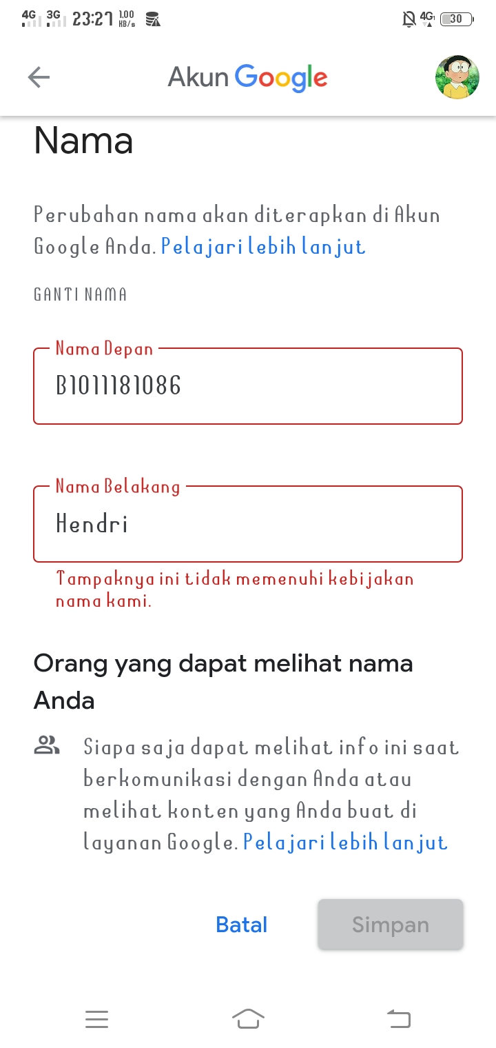 Masukkan nama depan, nama belakang, nama pengguna (alamat email), .