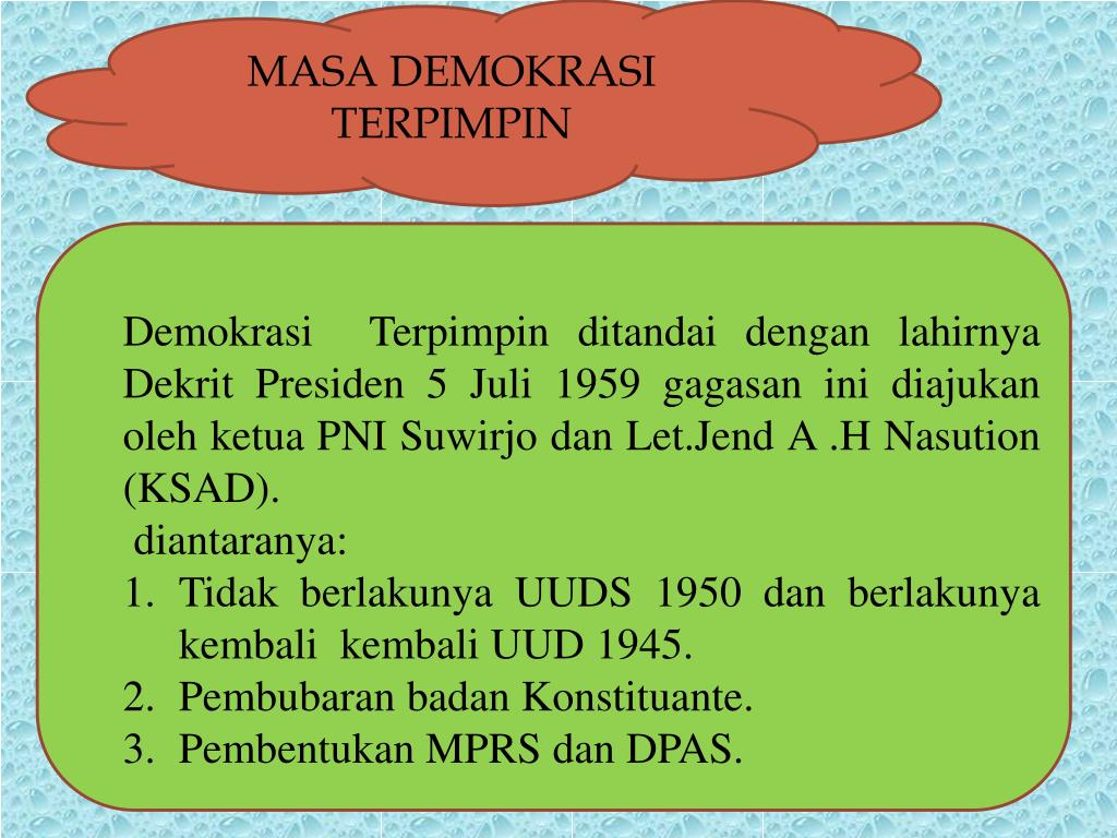 Presiden soekarno mengeluarkan dekrit presiden 5 juli 1959 : Dalam pidatonya, soekarno mengkritik cara kerja konstituante yang kurang mengalami kemajuan selama dua tahun lima bulan dan 12 hari. 1 modul kelas xii indonesia pada masa demokrasi parlementer (demokrasi liberal) dan demokrasi terpimpin disusun oleh : Indonesia era demokrasi terpimpin adalah sebuah periode dalam sejarah . Menetapkan uud 1945 berlaku bagi segenap bangsa indonesia dan .